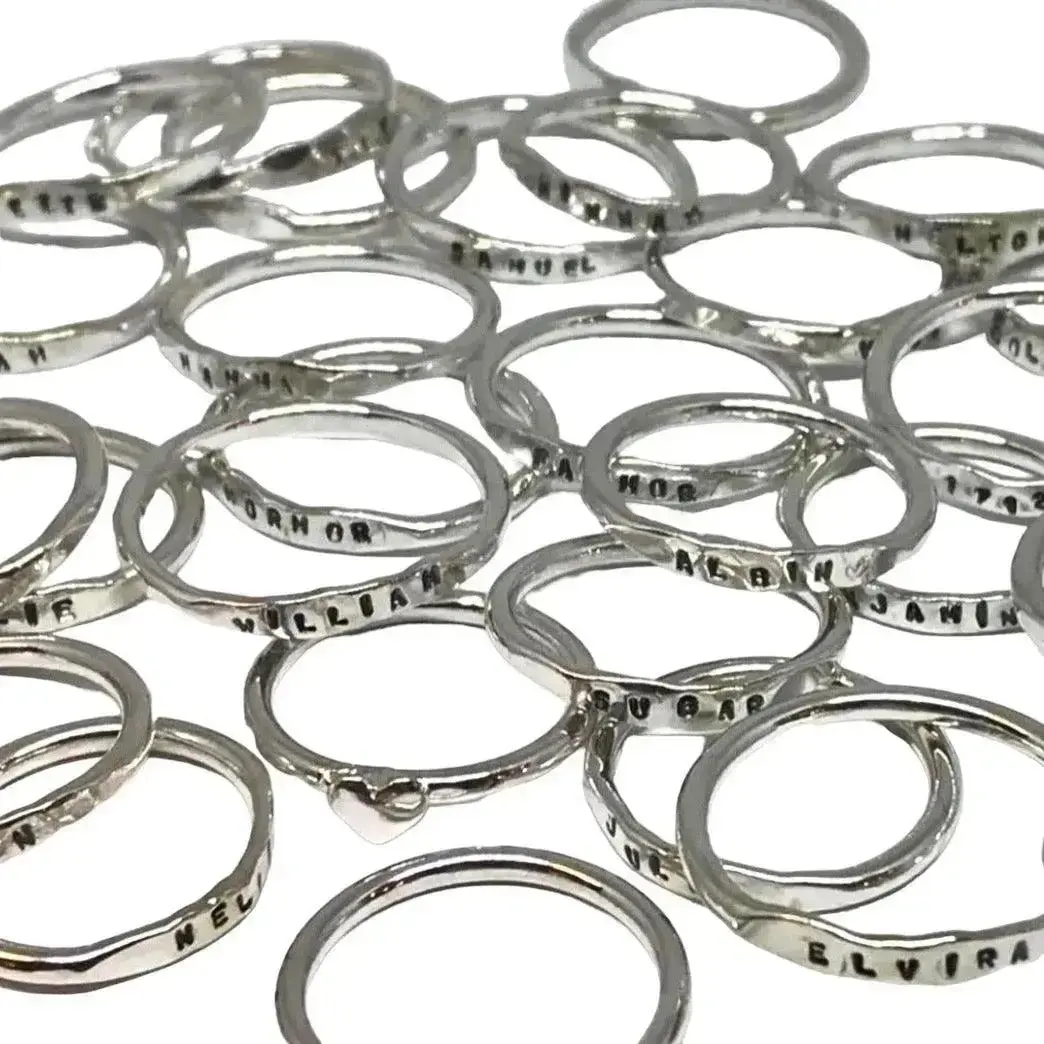 Våra namnringar finns i bredden 2–4 mm och stämplas för hand – varje ring blir unik med en rå, personlig känsla. Fulländad i sitt uttryck, inte i sin perfektion.