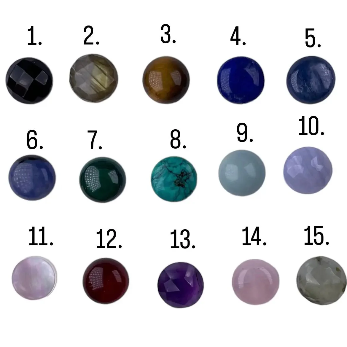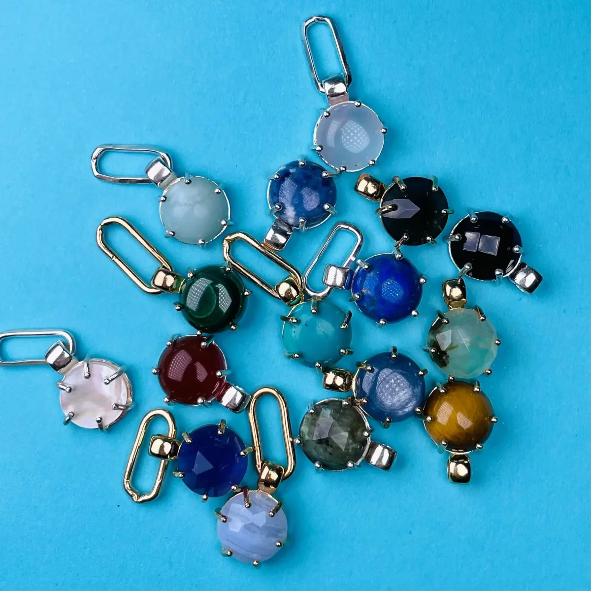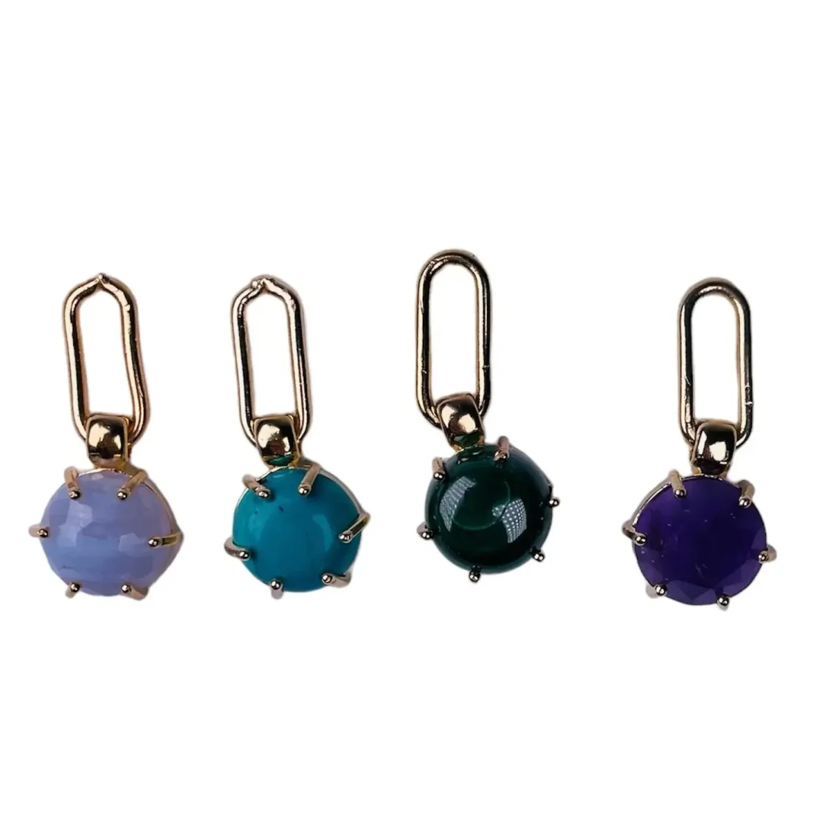 Stenarna som sitter på går att få i massa olika färger. På sista bilden kan du se alla olika och vilka nummer de tillhör. De går även att få alla i både guld och silver samt med avlång ögla eller vanlig rund.