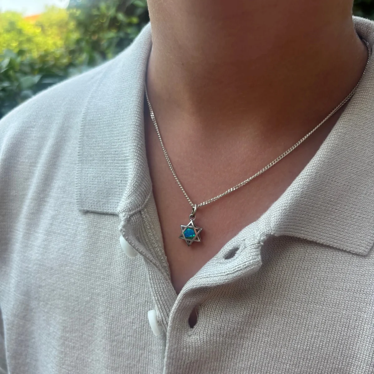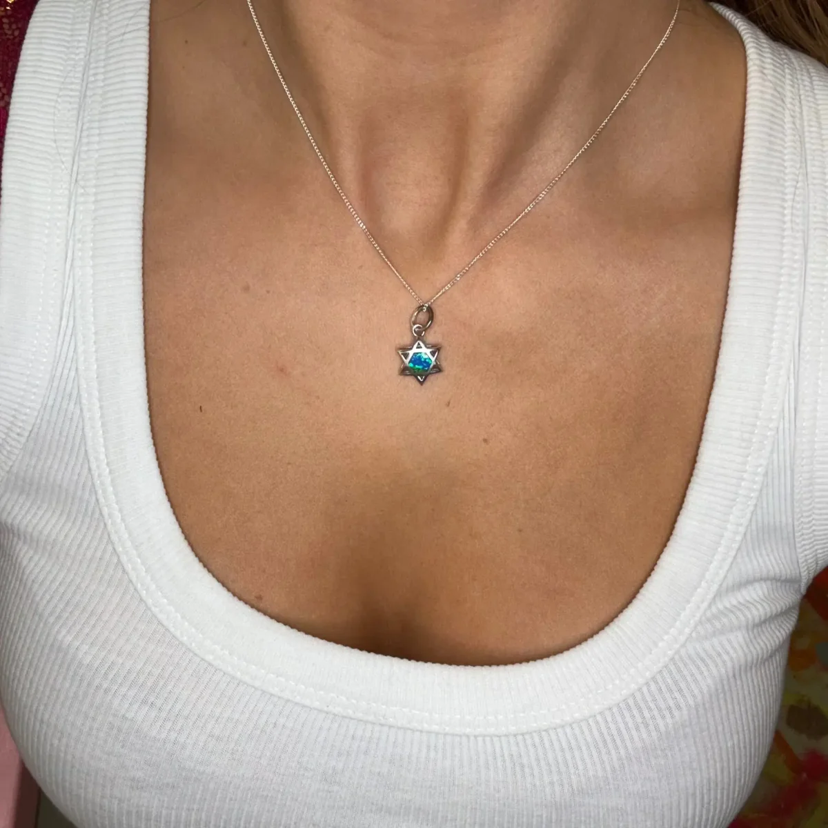 Så snygg Davidsstjärna med en glimrande sten i mitten som är blå åt ena hållet och vit åt andra.