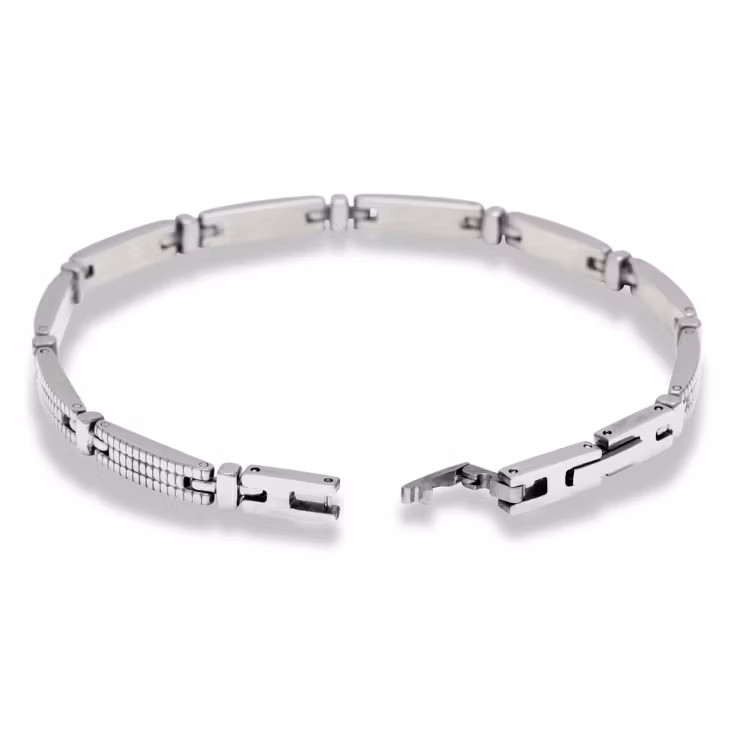 Ett distinkt och modernt armband i mönstrat rostfritt stål som ger ett kraftfullt men sofistikerat uttryck. Det detaljerade mönstret skapar liv och karaktär i designen, samtidigt som den slitstarka stålkonstruktionen ger en exklusiv och hållbar känsla.