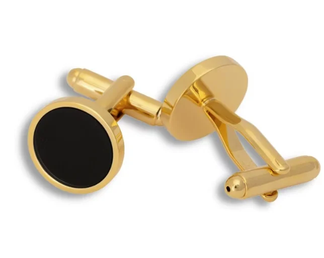 Runda guldfärgade PVD-pläterade manschettknappar i mässing med svart bricka i mitten med matchande slipsnål. Setet kommer med en snygg liten ask att förvara accessoarerna i när de inte används.