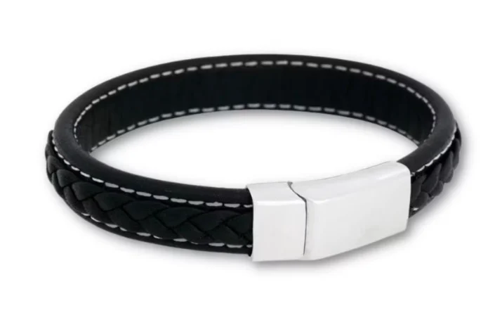 Svart läderarmband med ett magnetlås i stål och snyggt flätat läder som ramas in av vita sömmar.