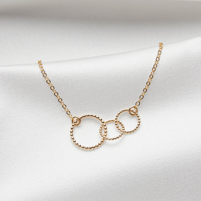 Ett vackert handarbetat guldpläterat halsband från kollektionen Mamma, design av Sofia Wistam. Den stora ringen symboliserar modern och de små ringarna barnen.