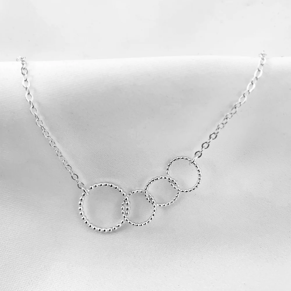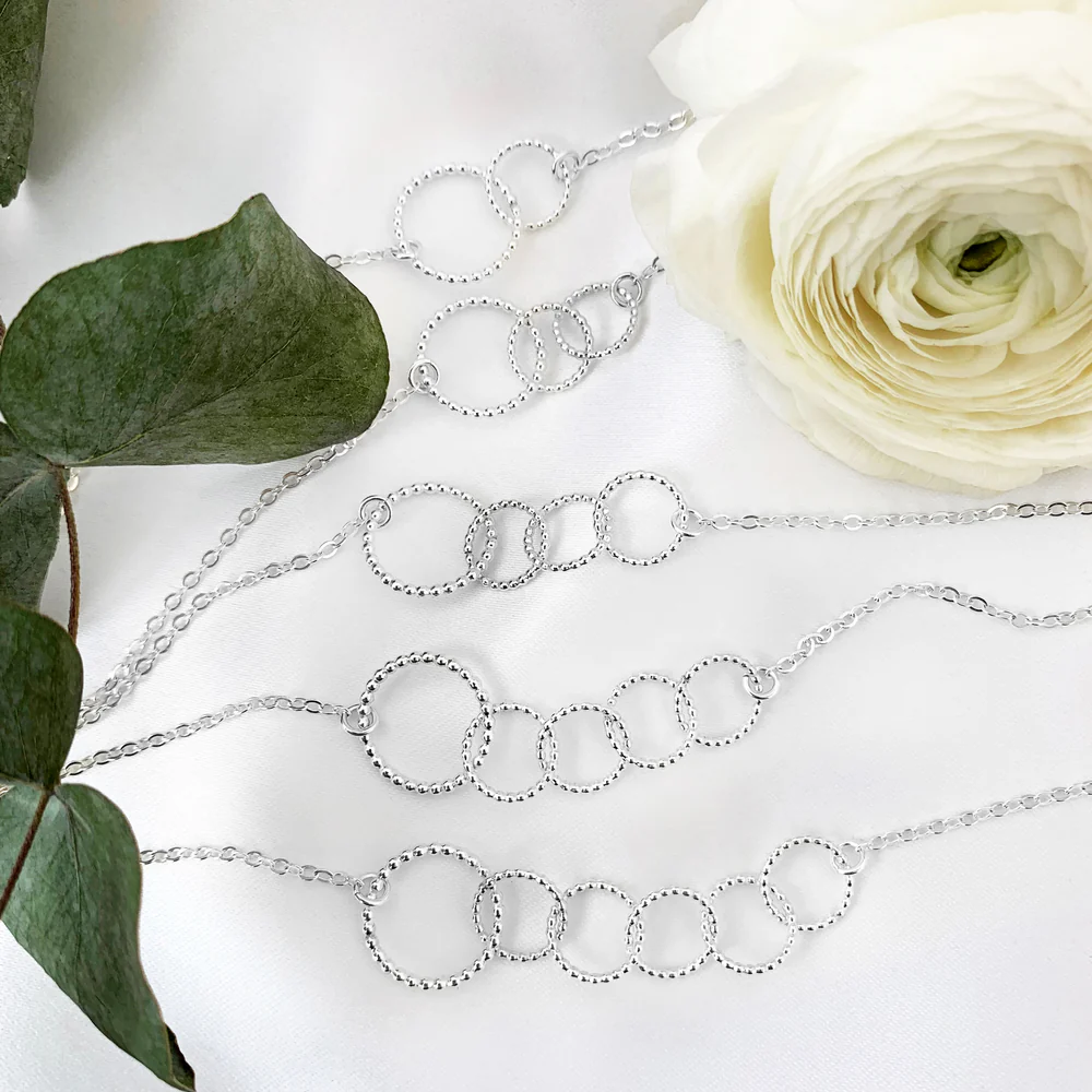 Ett vackert handarbetat halsband i äkta silver från kollektionen Mamma, design av Sofia Wistam. Den stora ringen symboliserar modern och de små ringarna barnen.