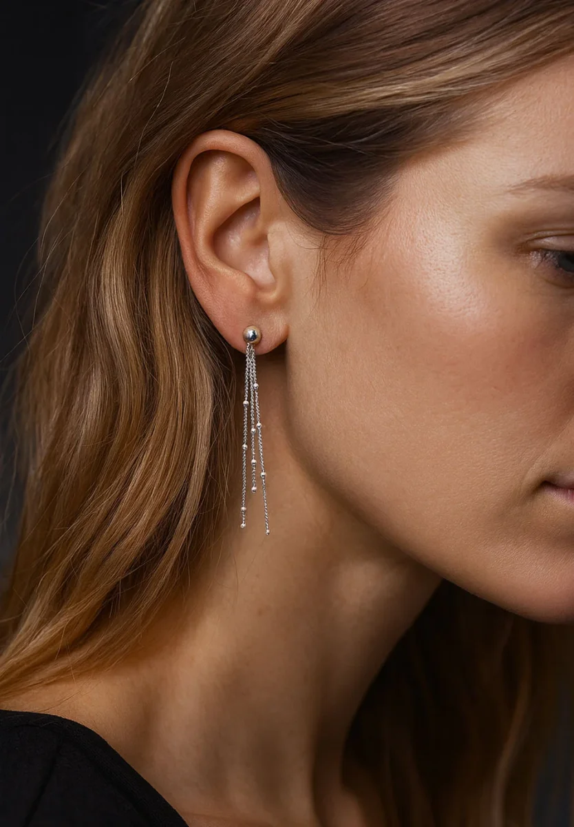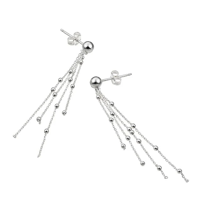 Långa fina silverörhängen med tunna kedjor och silverkulor.