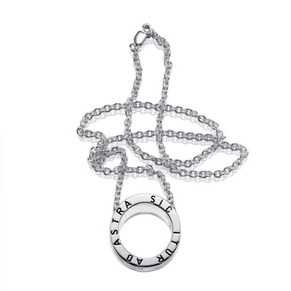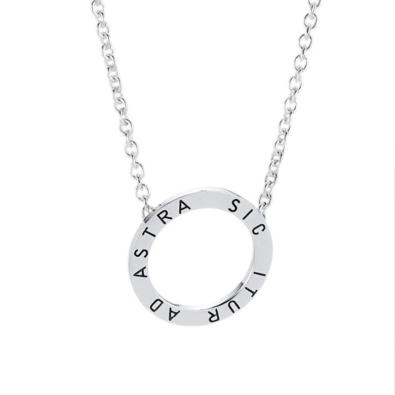 Halsband i återvunnet sterlingsilver med en ring stansad med Sic Itur Ad Astra – vägen till stjärnorna på latin.