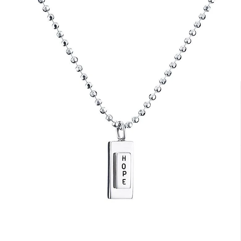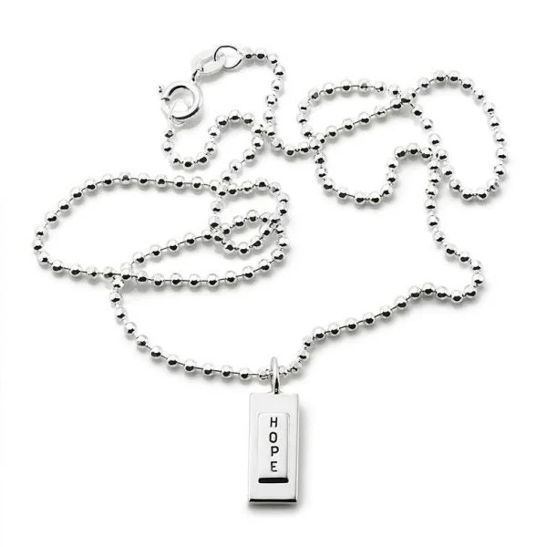 Hängsmycke i återvunnet sterlingsilver stansat med HOPE på en kulkedja.