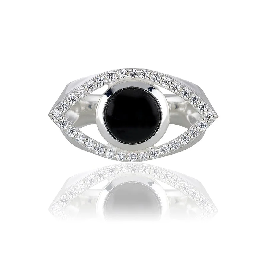 Devine eye ring – ser tillbaka på världen och skyddar dig från negativitet och skada. Bär den för att hålla ditt liv i balans och vet att du alltid är skyddad. Ett smycke i formen av ett öga med en pupill i onyx som vackert omringas av stenar. Material: 925 sterlingsilver. Sten: cubic zirkonia