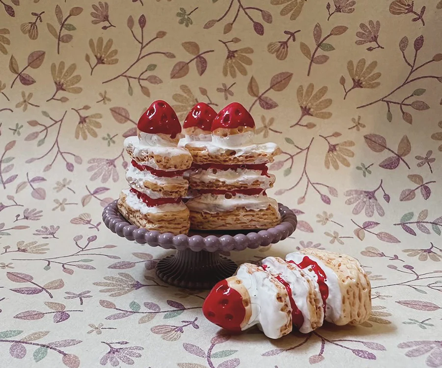 Miniatyr – Våfflor med grädde, sylt och jordgubbe, miniatyrmat leksaksmat våffla för dockhus, 4 st