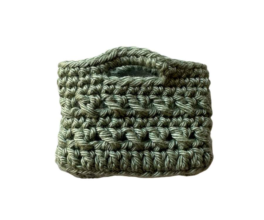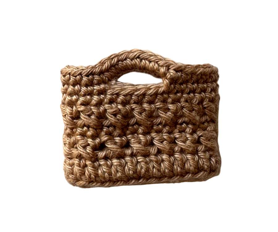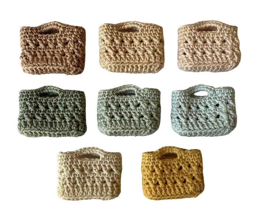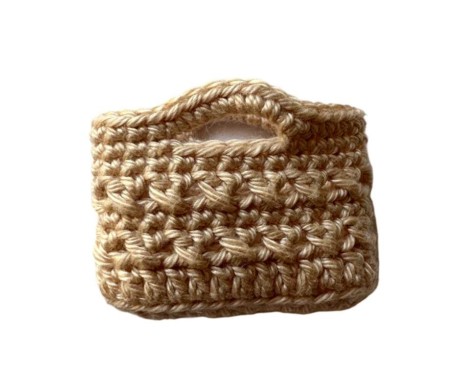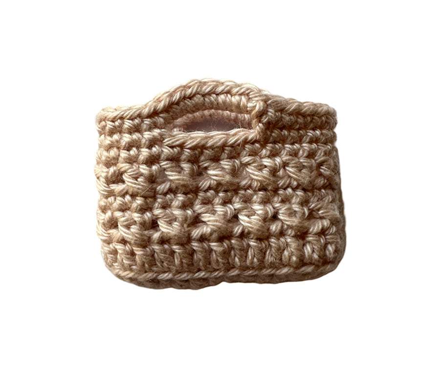 En minityrväska, virkad väska i miniatyrformat, som är ett måste för varje miniatyrälskare. Fin, unik och elegant väska i miniatyr, en strandväska som är perfekt till små dockor, figurer, Maliegs möss eller kaniner eller till miniatyrsamlingen. Låt dina dockor få en härlig miniatyrväska att ta med på promenaden eller till utflykten på stranden. Perfekt till mataffären, stranden eller picknicken. Passar bra till Mailegs möss och mindre kaniner.
