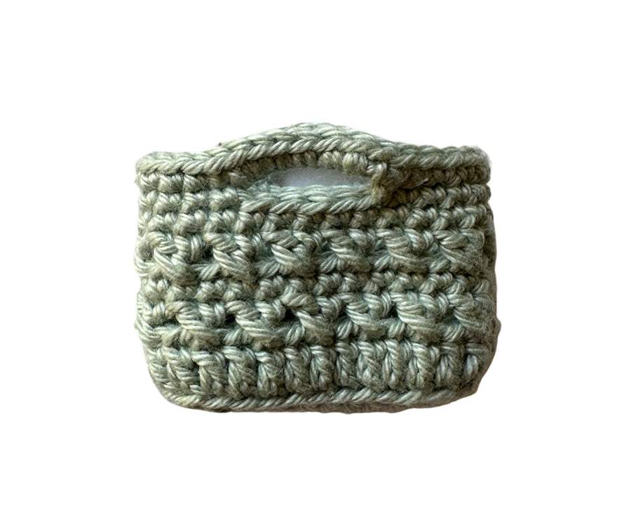Matchar flera av de andra virkade sakerna från Liten mindre minst i både stil och färger. Handtagen på väskan är lätta att greppa och väskan kan stå stadigt med fyllnad i vilket gör att den passar bra i alla dockhus, dockskåp eller tittskåp. Handvirkad i Sverige med omsorg och i 100% bomull.