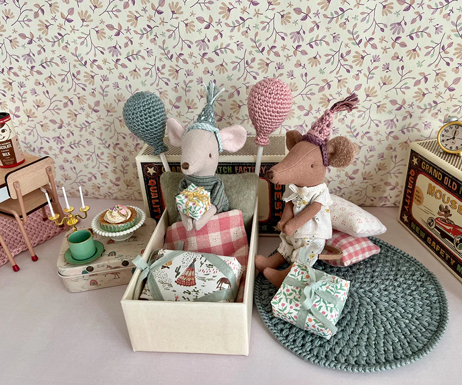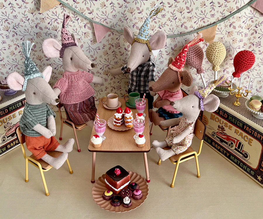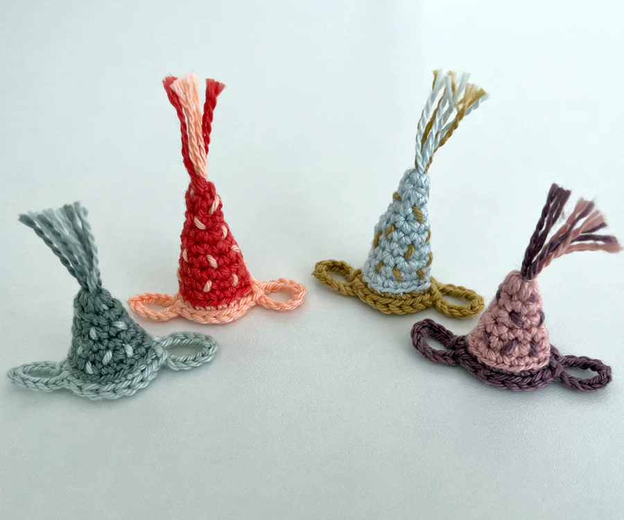 Underbart söta små partyhattar till mössen att ha på sig när de ställer till med kalas. Dessa passar både till mamma/pappa mus och till storasyster/storebror och säljs i 2-pack med en låg och en hög modell i olika färger. Komplettera med mat, olika bakverk och girlang så blir det en riktig fest. Det finns även partyhattar till lillasyster/lillebror. Matchar flera av de andra virkade sakerna hos Liten mindre minst i både stil och färger. Hattarna kan variera något i storlek då de är handgjorda. Handvirkade i Sverige med omsorg och i 100% bomull.
