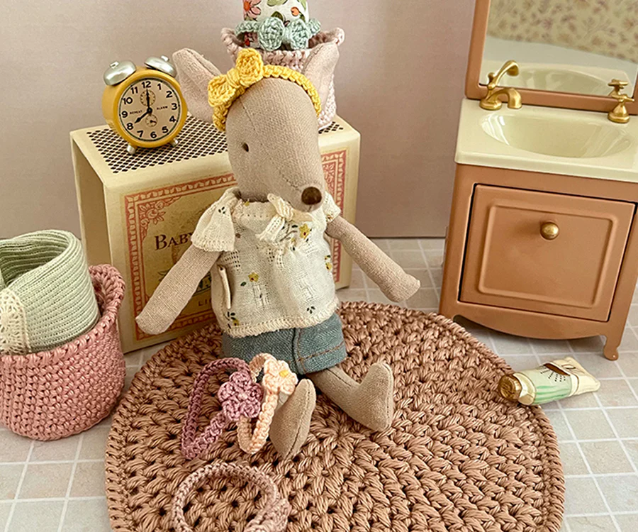Söta små hårband till storasyster mus när hon vill göra sig fin. Hårbanden finns i flera olika färger och har en fin rosett som dekoration. Matchar flera av de andra virkade sakerna från Liten mindre minst i både stil och färger. Handvirkade i Sverige med omsorg och i 100% bomull.