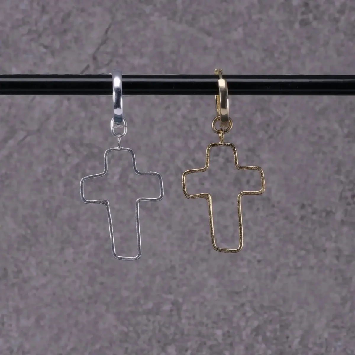 Örhänget för dig som uppskattar det minimalistiska. Istället för ett massivt kors har vi valt att arbeta med en luftig konturdesign som gör smycket lätt, elegant och otroligt stilrent. Det är ett örhänge som tar plats genom sin unika form, men som behåller en diskret och sofistikerad framtoning.