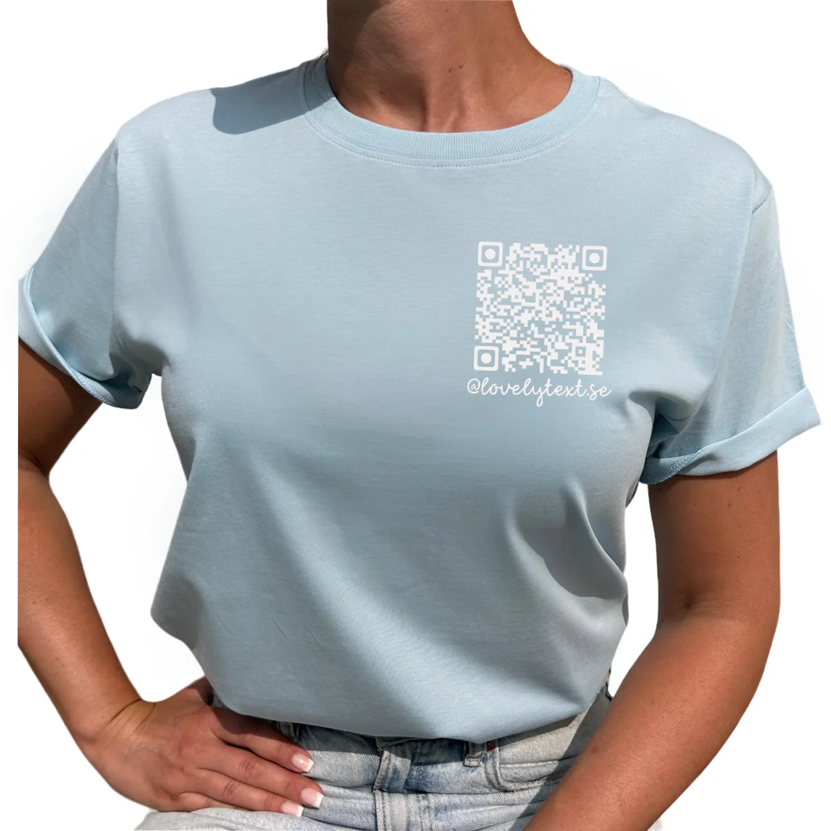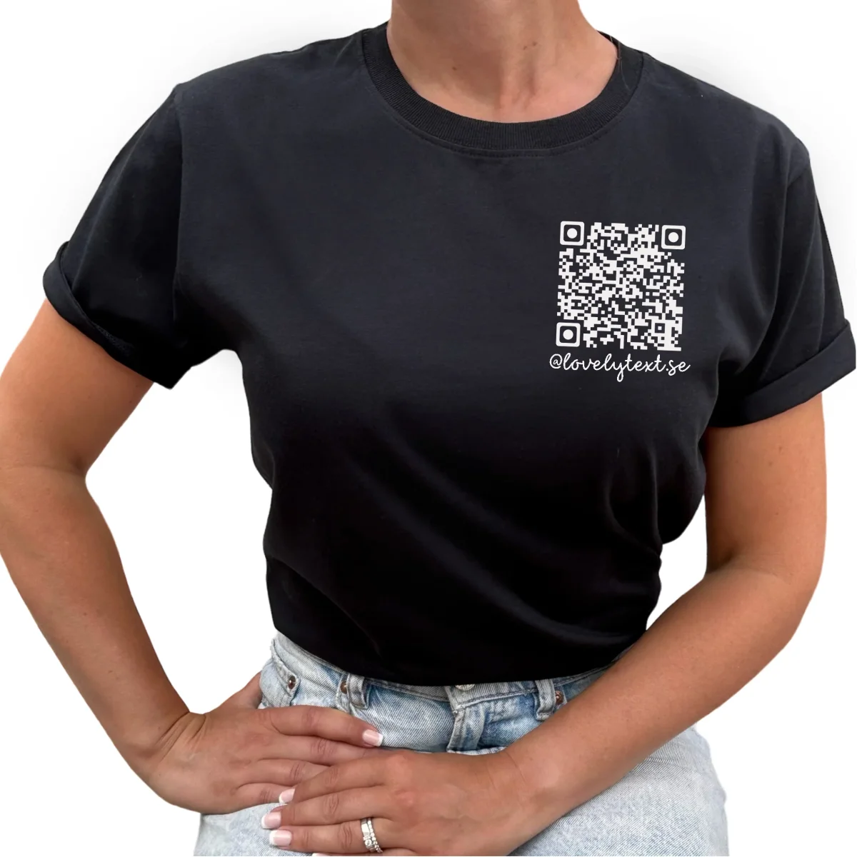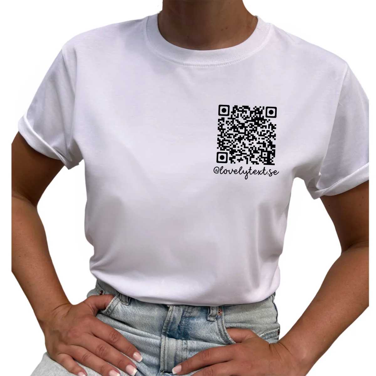 Tryck din QR kod på din t-shirt! Låt dina vänner scanna koden med mobilen som länkar dem till din URL.