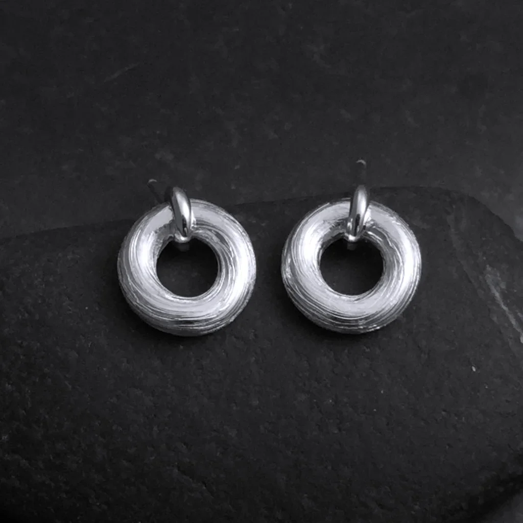 Örhängen med stift i sterling silver med grovt huggen råriven yta. Ø ca 10 mm