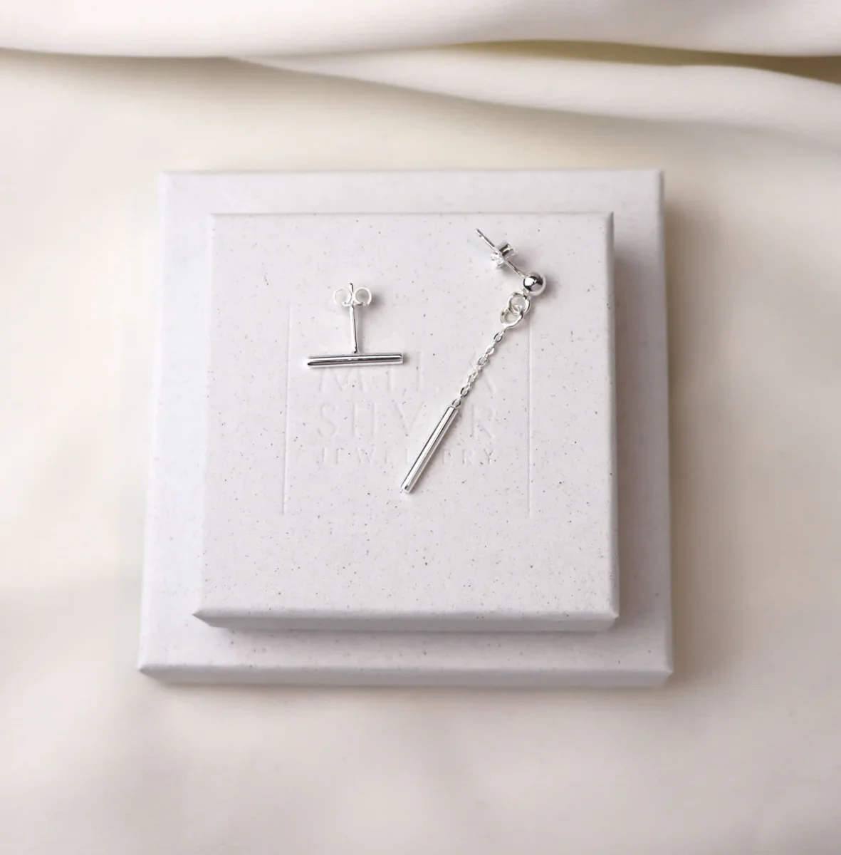 Ena örhänget har bara en stav, det andra örhänget har kedja och stav.