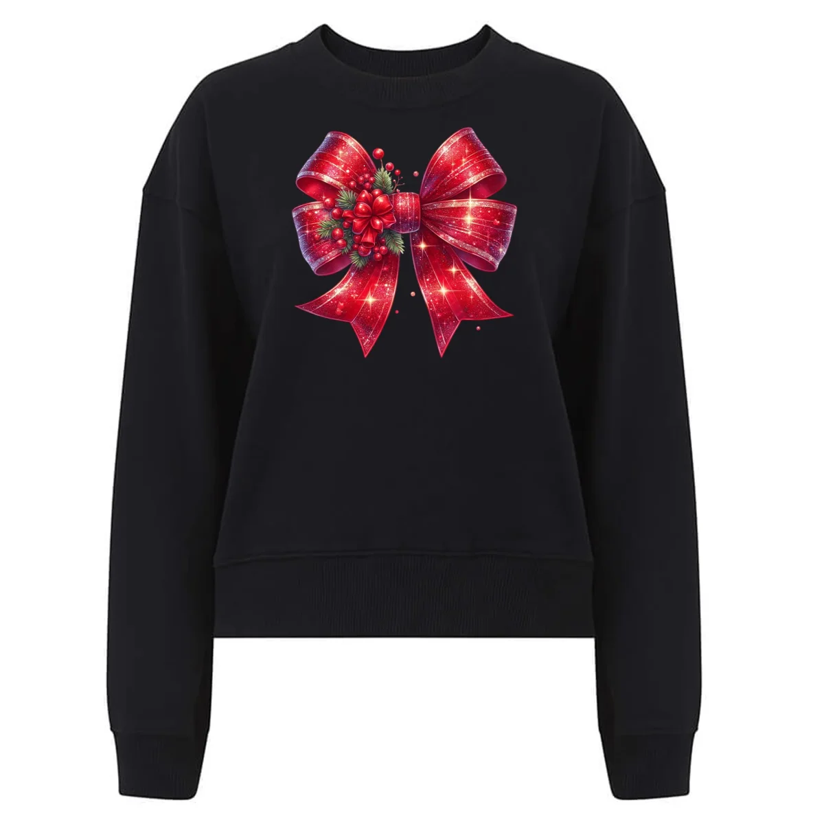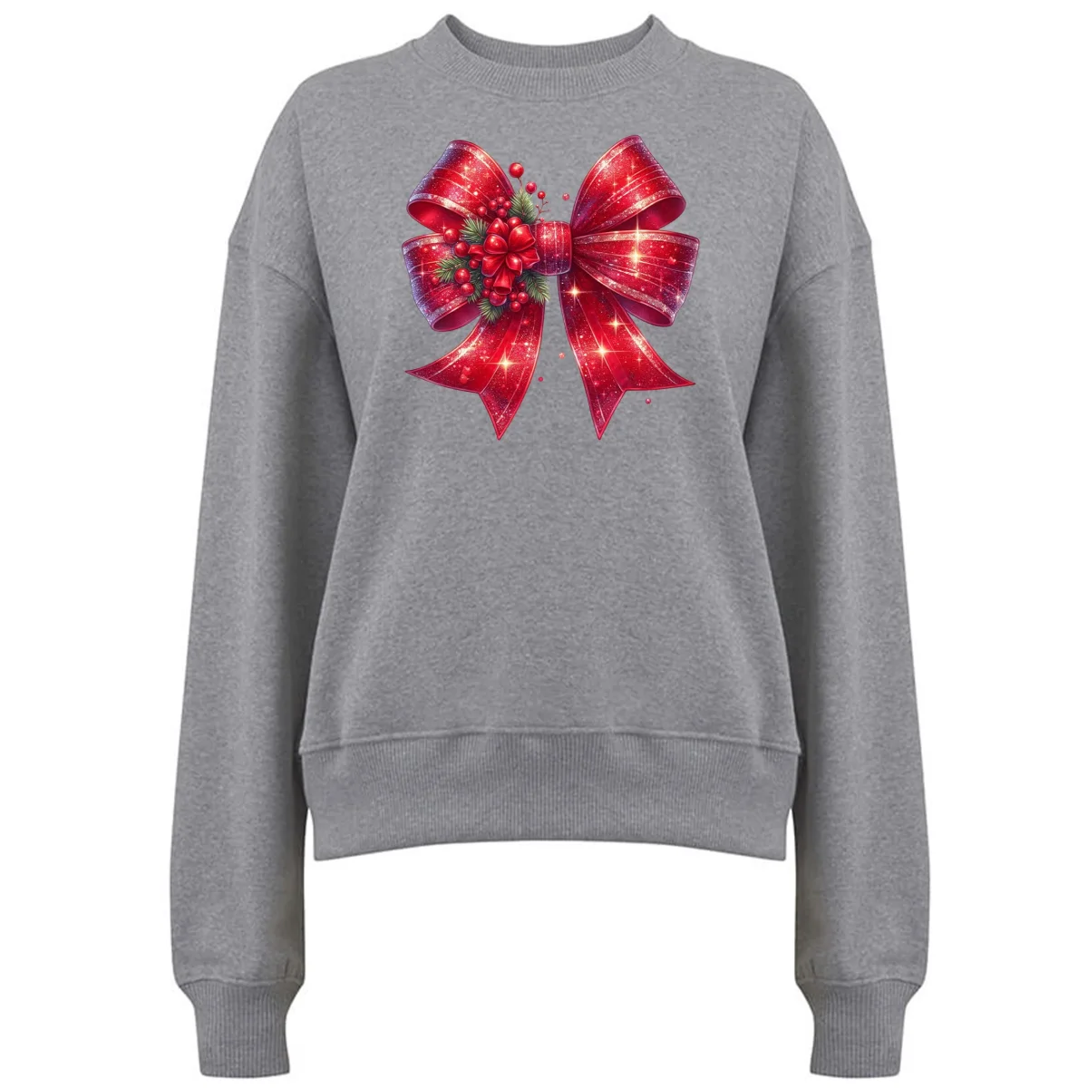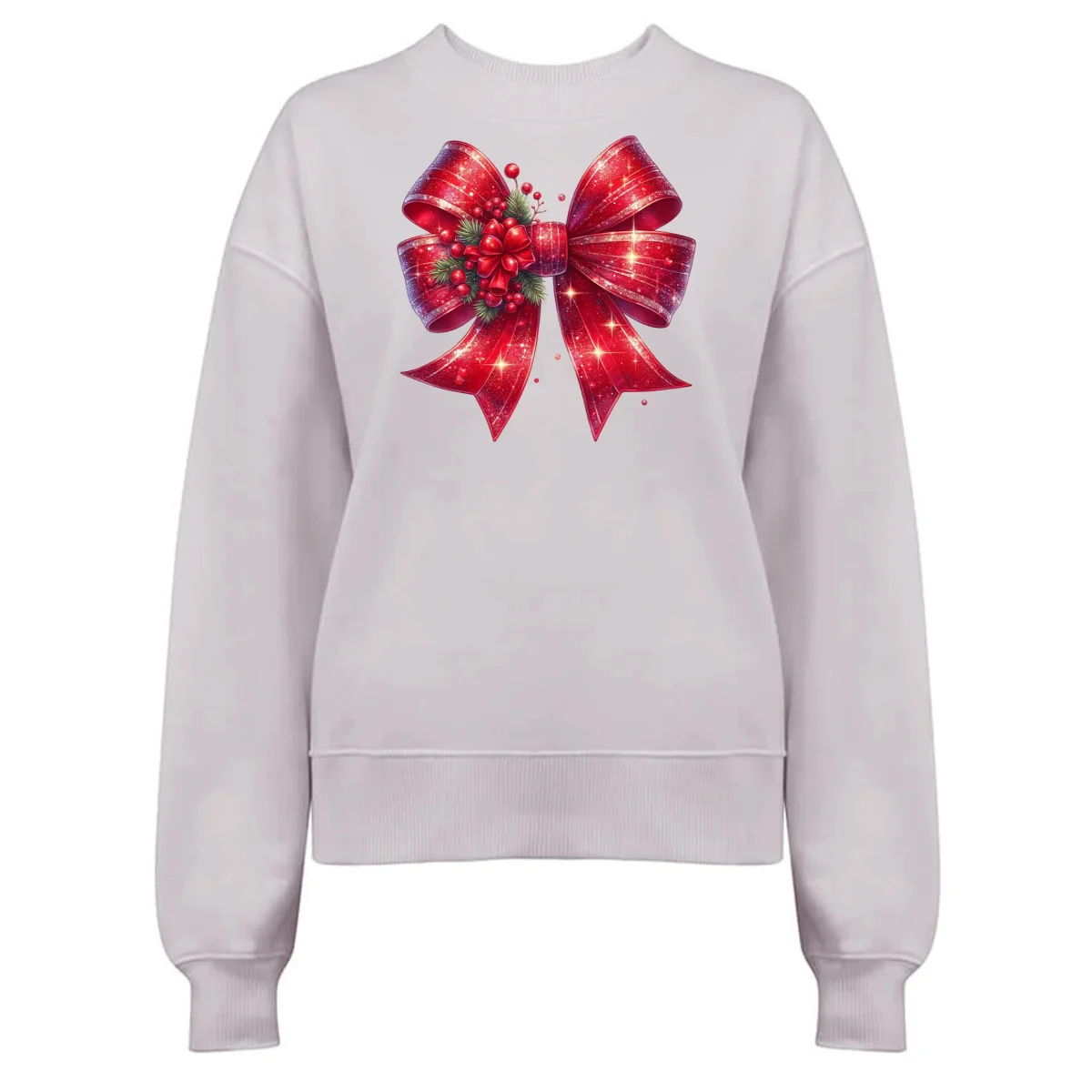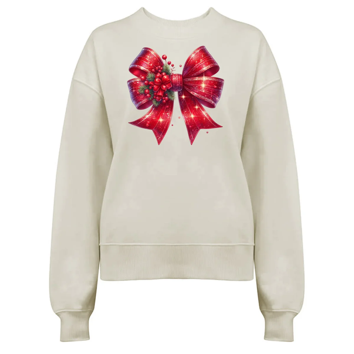 Lys upp din julstil med denna tröja med röd glittriga mistel rosett. Den perfekta tröjan för att fira jul med stil och sprida lycka under hela säsongen. En collegetröja i 100 % ekologisk bomull för dam i hög kvalitet med rund halsringning och droppad axel.