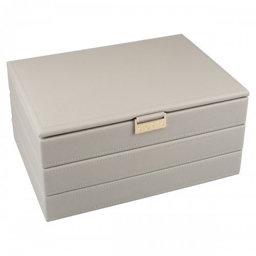 Ett mycket elegant stapelbart skrin med tre våningar. Grå/beige ytterklädsel med ljus textilklädsel på insidan.