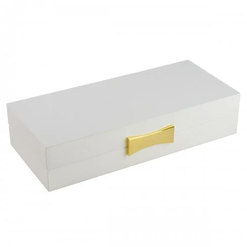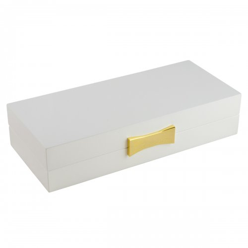 Vackert träskrin i blanklackad vit yta och guldfärgad “rosettbricka” på skrinets framsida.