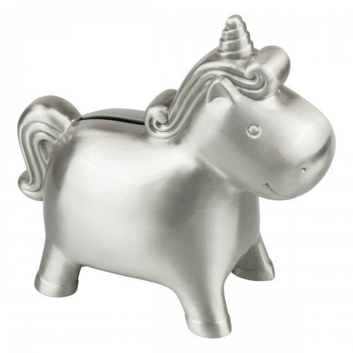 Enhörningssparbössa i metall med tennfinish. En perfekt doppresent, namngivningsgåva eller baby shower-present. Välj gravyr för att göra sparbössan extra personlig.