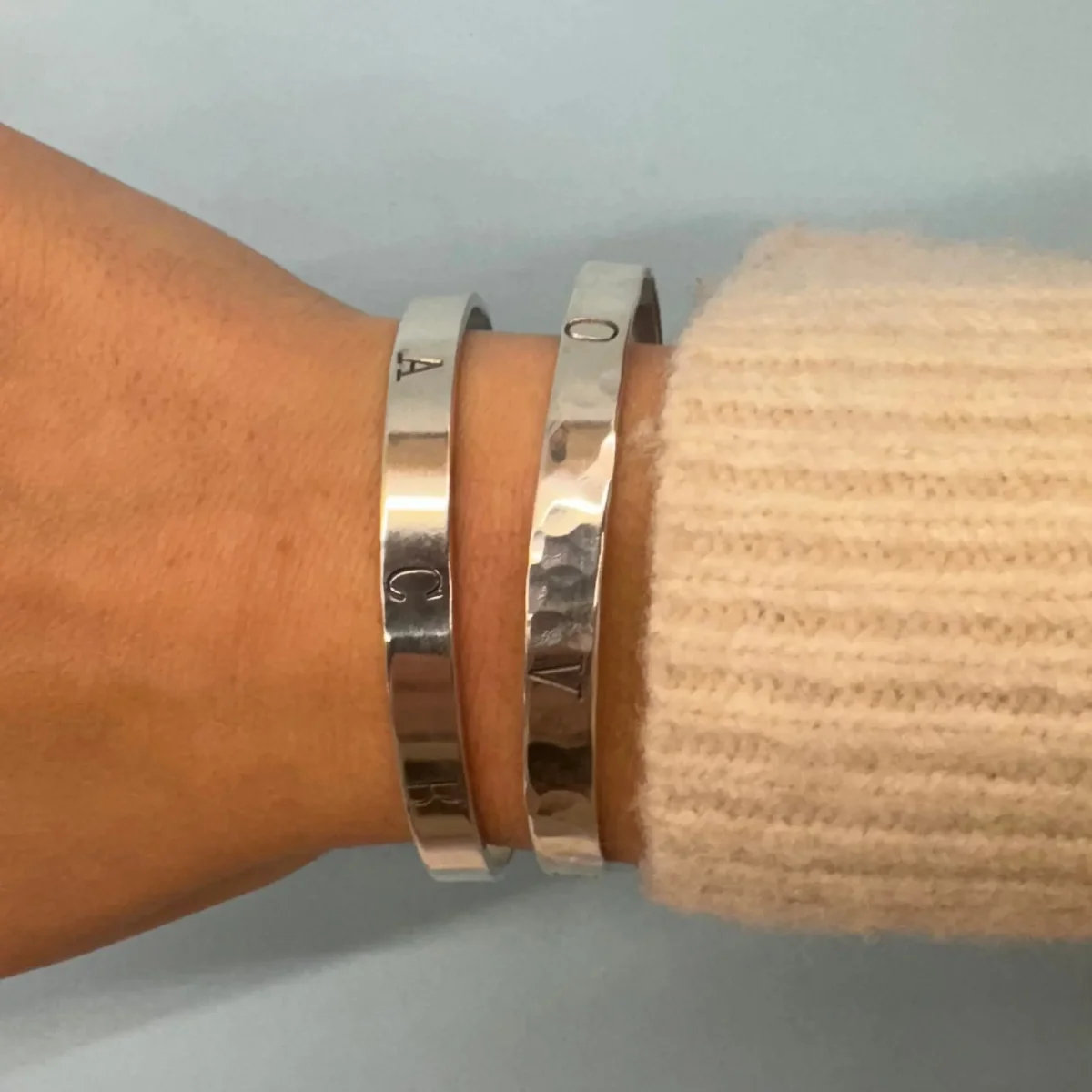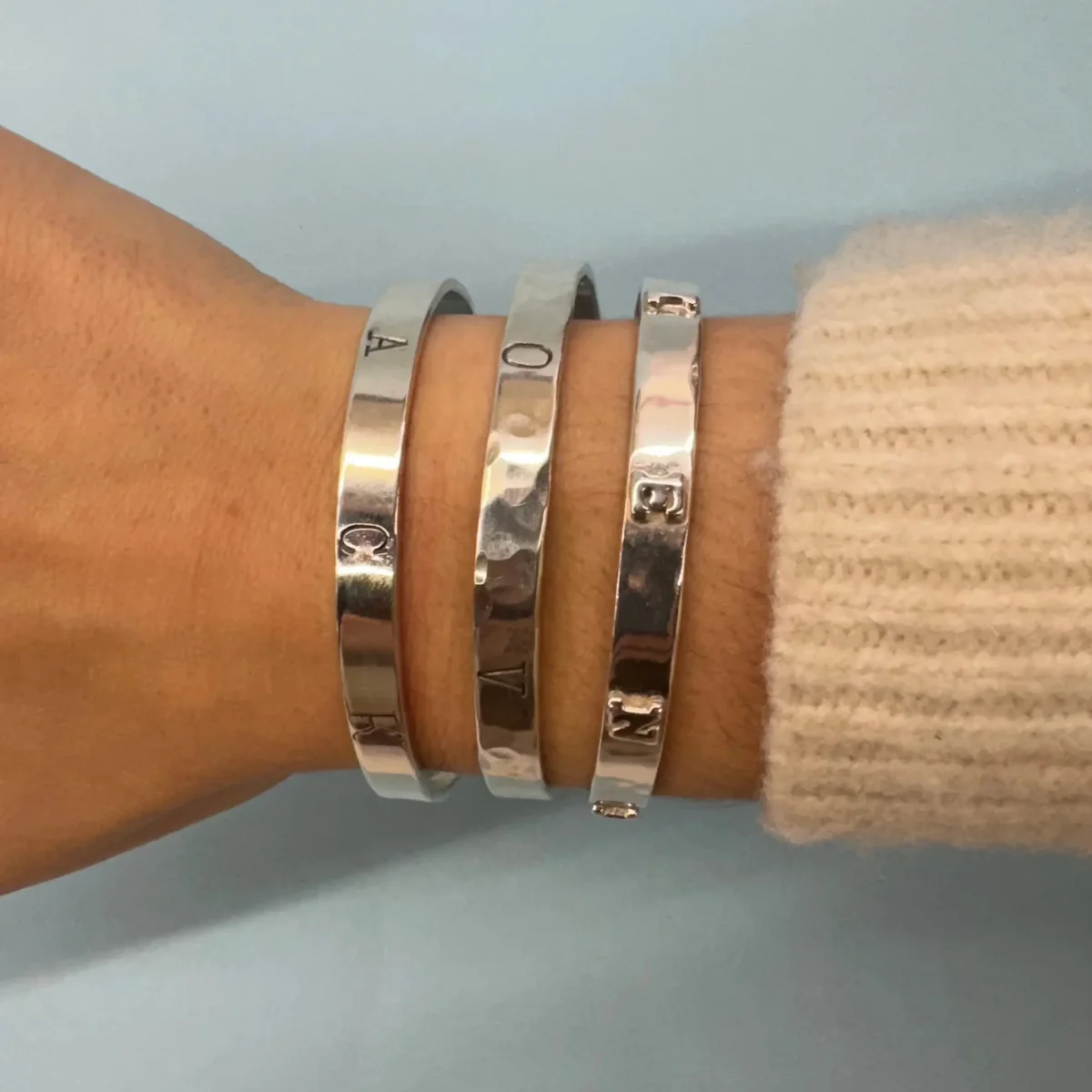 Detta är ett alternativ av vårt populära ordarmband som alla älskar. Istället för fastlödda bokstäver är de stämplade. På sista bilden ser du även ordarmbandet med fastlödda bokstäver