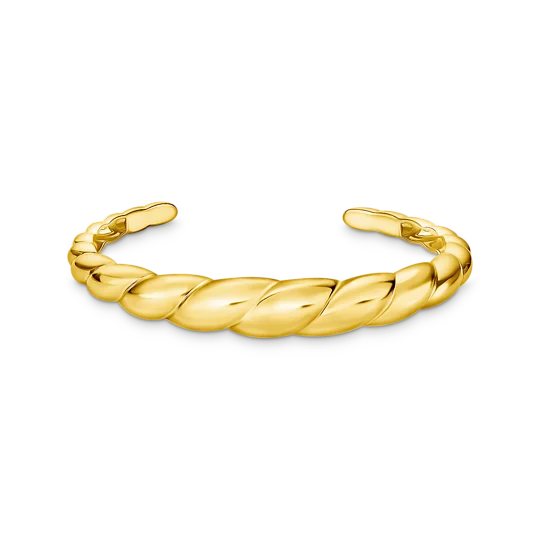 Denna armring i återvunnet silver utstrålar diskret lyx. Den är tillverkad på ett hållbart sätt med högsta möjliga hantverksskicklighet och omsorg och har en 18k guldplätering. Den speciella vridna designen på armbandet är inspirerad av organiska former och återspeglar klassiska silhuetter. Tack vare den tidlösa elegansen och den lätta finishen kommer du att älska att bära den guldfärgade armringen hela dagen och hela natten.