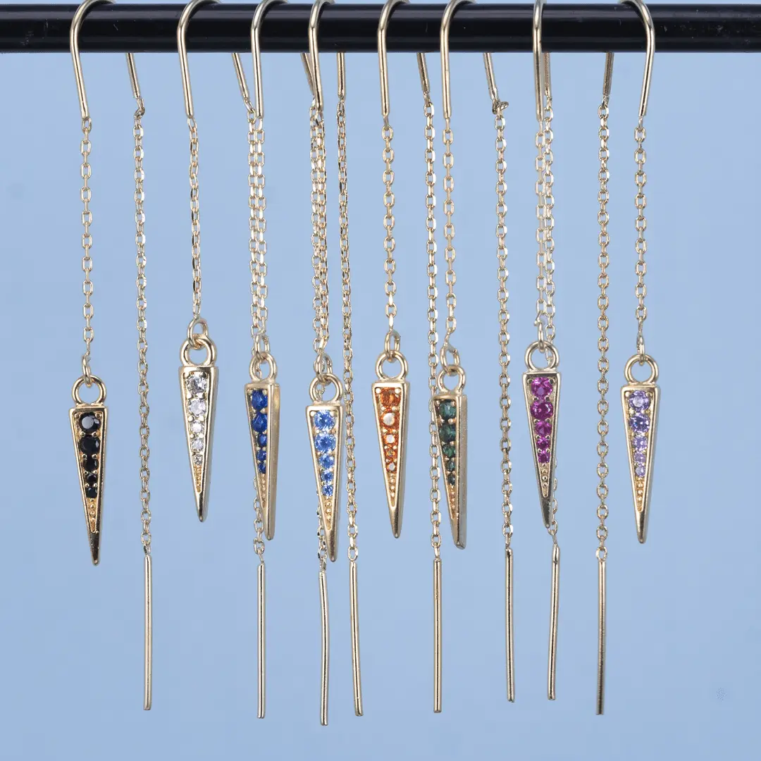 Ett örhänge som är lika bekvämt som det är vackert. Den tunna kedjan träs enkelt genom örat och ger en fjäderlätt känsla – du märker knappt att du har det på dig. Samtidigt fångar den smala taggen ljuset med gnistrande zirkoner i vackra nyanser och skapar ett elegant spel mellan färg och form.