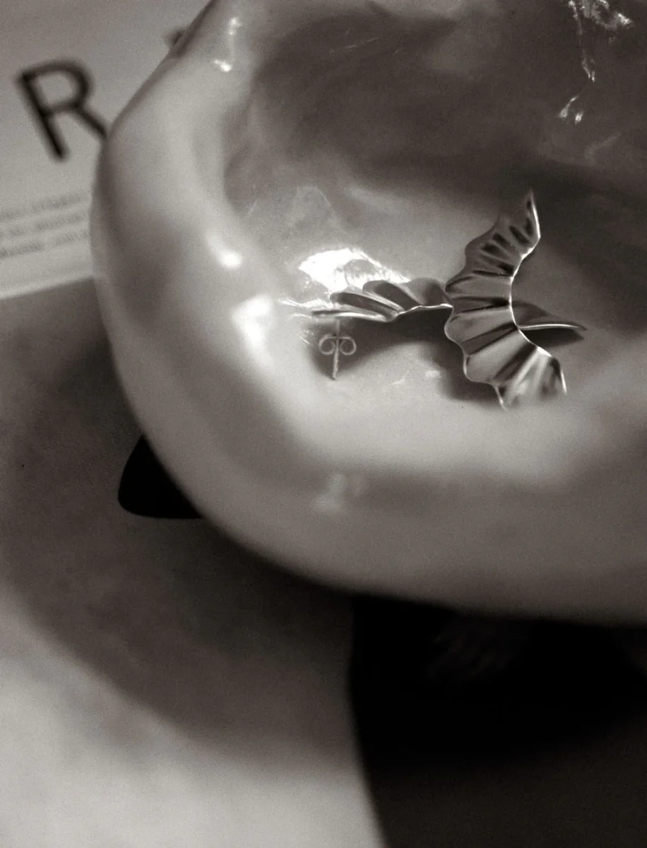 Volang örhängen är unika. Formen gjordes först i lera för att sedan gjutas i silver. Formerna kom till liv när ljuset reflekterade silverytan. Den svängda formen på örhänget ramar in ansiktet fint.